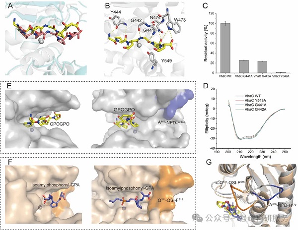 VhaC 与胶原肽 GPOGPO 的对接模型显示,P1' 甘氨酸的羰基氧 / 氨基氮分别与 G441 的氨基氮 / G442 的羰基氧形成主链相互作用,Y549 的羟苯基与双 G 基序相对,共同构成 S1' 底物口袋。