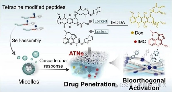 Fig1. 自组装人工拓扑纳米结构(ATNs)增强癌症免疫治疗中生物正交前药激活与药物穿透的机制示意图