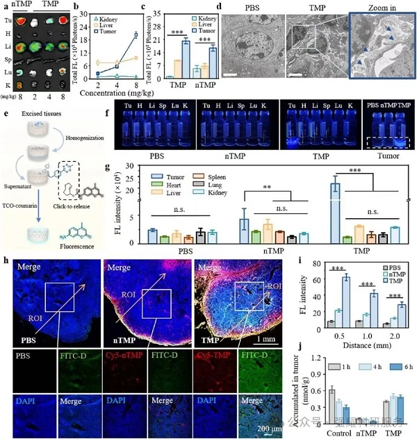 (1)肿瘤靶向与穿透:TMP 在肿瘤中的荧光强度是肝脏的 2.1 倍、肾脏的 21.0 倍;药物穿透深度 0.5 mm 处提升 7.8 倍,2.0 mm 处仍提升 5.7 倍(图 5c/i);