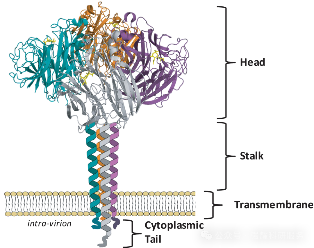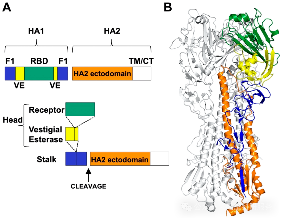 (1)HA结构特征血凝素(Hemagglutinin, HA),是流感病毒表面含量最高的抗原蛋白,外观呈 “蘑菇状” 三聚体结构。成熟的HA蛋白在病毒表面以非共价同源三聚体形式存在,每个三聚体分为头部和茎部两个结构功能域。HA由 HA1 和 HA2 两个亚基组成:①HA1:是球状头部的主要成分,位于膜-远端,负责结合宿主细胞;