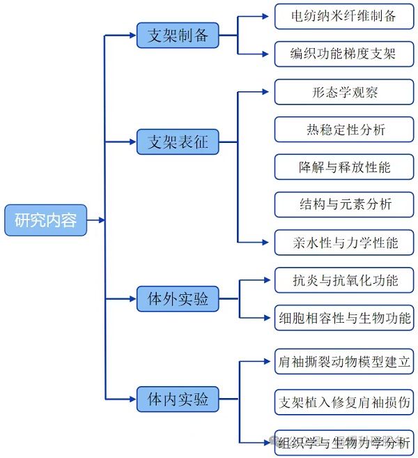 该功能支架能够在体内对肌腱、纤维软骨和骨骼界面进行仿生重建,通过整合抗炎、抗氧化和生物活性特性;促进组织浸润并促进肌腱-骨骼界面的功能整合;最后,利用兔模型在体内进一步评估支架的治疗潜力。