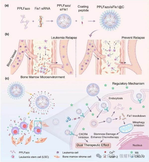 该系统将阳离子聚合物Plerixafor与偶氮苯接头(PPLFazo)和Fis1 siRNA(siFis1)特异性地共同递送到骨髓,以靶向具有骨髓微环境响应肽涂层(C)的白血病干细胞(LSC)