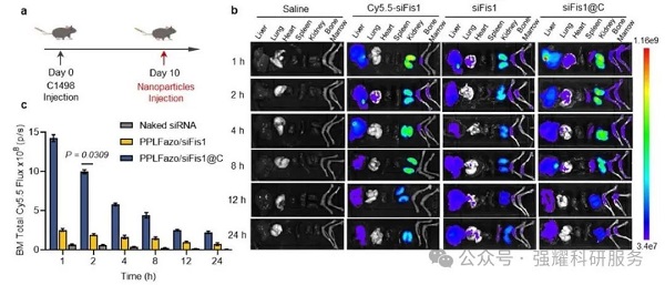 Fig 4. PPLFazo/siFis1@C在AML小鼠体内的生物分布及骨髓靶向作用