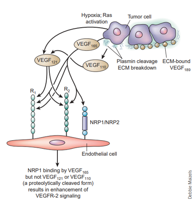 有多种不同亚型,包括VEGF121、VEGF165、VEGF189和VEGF206等。VEGF亚型的生物活性取决于两个方面:与VEGFR共受体相互作用和蛋白水解加工的能力。VEGF121是一种可自由扩散的蛋白质,缺乏HSPG和NRP结合域,不能保留在细胞表面和细胞外基质(ECM)中;VEGF165有两个特性:它可以分泌或储存在生产细胞附近;VEGF189和VEGF206包括HSPG和NRP结合域,能够以比VEGF165更高的亲和力和共受体结合;此外,蛋白酶裂解VEGF189能够释放活性的、可自由扩散的VEGFA110。血管生成中最活跃的是VEGF165,在许多癌症中过表达,具有最佳的生物利用度和生物效力。